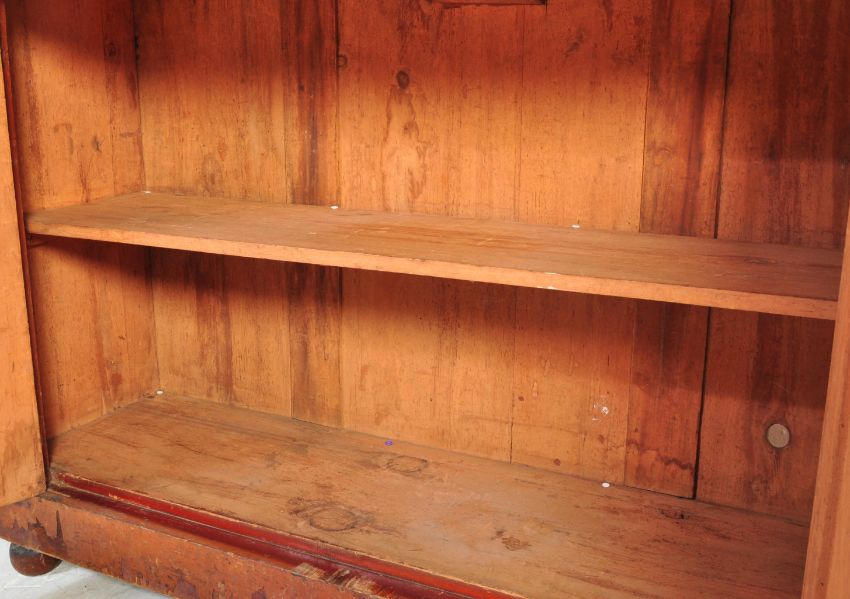 A Victorian 19th century mahogany library bookcase cabinet. Raised on a plinth base with twin door cupboard under short drawers. Above, a twin door glazed bookcase cabinet with flared pediment atop. Dismantles into 2 pieces for ease of movement. Measures approx: 225cm x 123cm x 44cm