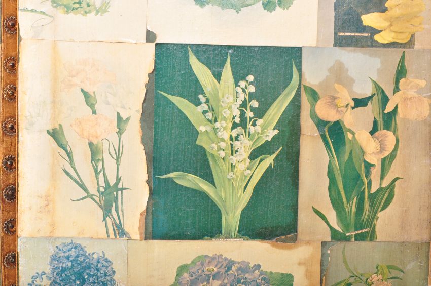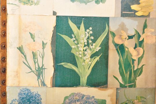 A large early 20th century four fold discretion / dressing screen. The four fold screens with studded edges and arched tops to each. Each panel having decoupage botanical and floral design. Measures approx; 166cm x 44cm x 15cm.