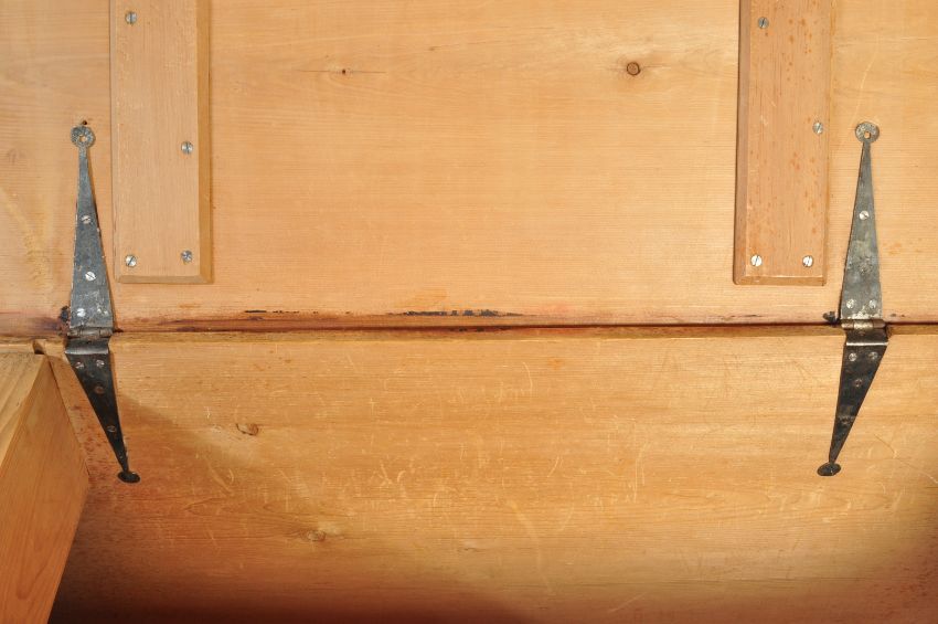 A Victorian 19th century pine blanket box / chest. The trunk having concealed candlestick compartments within and being raised on tapered feet with brass escutcheon and dove tail joints throughout. Measures 113cm x 66cm x 58cm.
