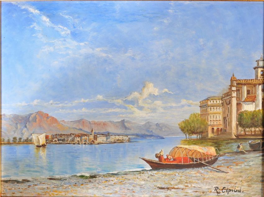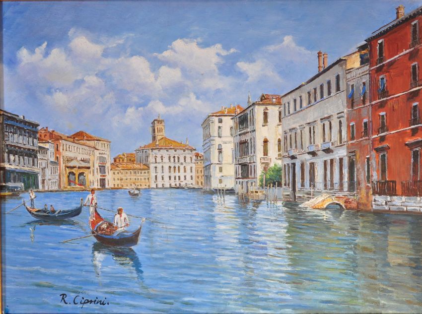 R Ciprini (Italian, 20th Century) A collection of 10 Venetian oil on board paintings of canal and city scenes. All being signed to the lower corner by the artist and within gilt frames. Measures approx: 37cm x 48cm.