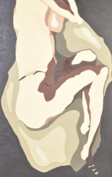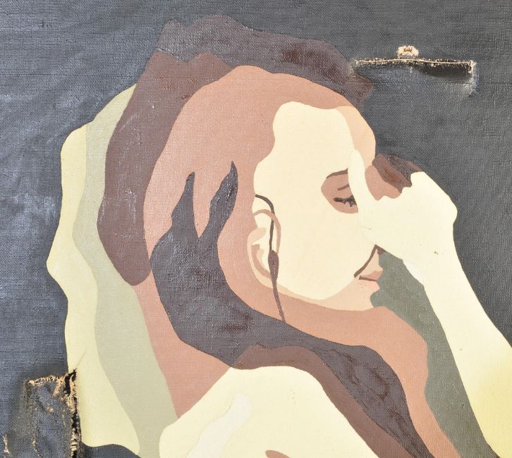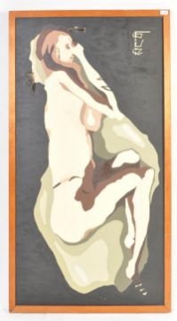 A large mid 20th Century oil on canvas abstract portrait painting depicting a nude lady laying on her side all on black ground. Signed to the top right and set within a pine frame. Measures approx; 151cm x 82cm. Sadly damage to the canvas in two places.