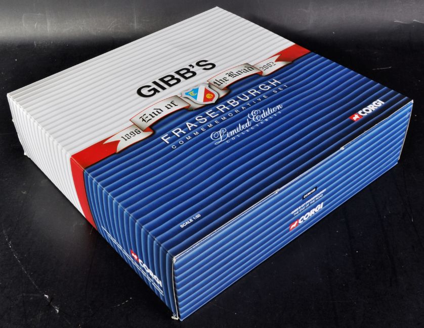 An original Corgi Limited Edition 1/50 scale boxed diecast set No. CC99125 ' Gibbs of Fraserburgh The End Of The Road ' commemorative set. The set containing x3 tractor units, fridge trailer and Limited Edition history booklet. Contents appearing mint.