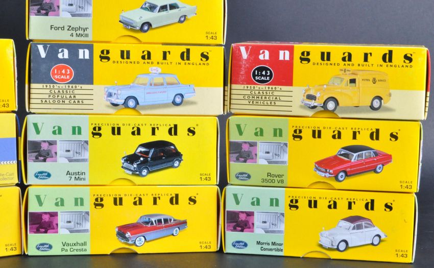 A collection of x10 assorted 1/43 scale Lledo made Vanguards diecast model cars to include; VA07100 Morris Minor Convertible, VA06502 Monza Red Rover 3500 V8, VA1100 Morris Minor Van, VA0600 Ford Zephyr 4 MKIII and others. All models with original boxes.