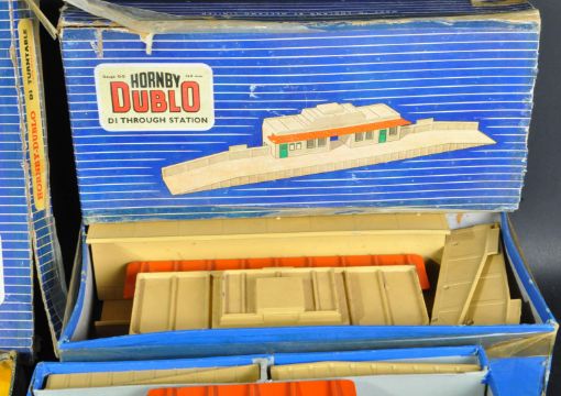 A collection of assorted Hornby Dublo 00 gauge model railway trainset locomotive trackside accessories to include; Through Station, Island Platform, Level Crossing, Signal Cabin, Signals, Buffer Stops, Turntable, Footbridge, Isolating Switch Points (left hand) and Diamond Crossing (left hand). All models retaining original boxes.