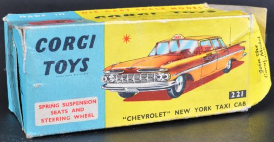 An original vintage Corgi Toys boxed diecast model No. 221 Chevrolet New York Taxi Cab. The model retaining original sticker decals and rear ariel appearing VG+. Within original box (taped to each side).