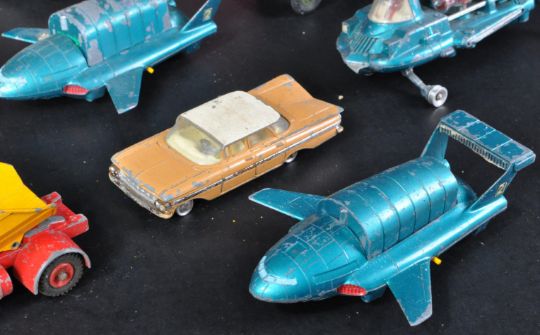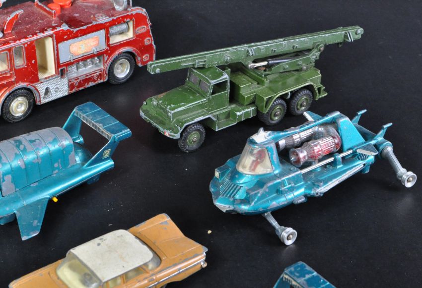 A collection of original vintage Dinky Toys and Corgi Toys diecast model cars and other vehicles to include; Dinky Toys 285 Merryweather Marquis Fire Tender, 101 Thunderbird 2, 351 UFO Interceptor, Corgi Toys Chevrolet Impala and others. Various playworn conditions.