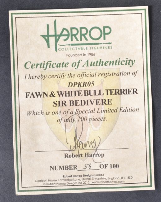 Robert Harrop - Knights Of The Round Table / Doggie People - DPKR05 - Fawn & White Bull Terrier Sir Bedibere. Limited Edition of 100. Highly detailed resin statue / figurine. Statue appears mint, with no damage. Boxed.Note; from a large collection of Robert Harrop & other statues / figurines. Condition is stated within each description, however buyers are reminded that such statements are not forensic reports and all items will remain sold 'as is'. As a rule, statues do appear mint and undamaged, but this is not guaranteed. Boxes range in condition, and some have wear from storage. In all instances buyers are required to satisfy themselves. Certificates / paperwork are present if photographed, if there are no photographs of certificates then one isn't present.