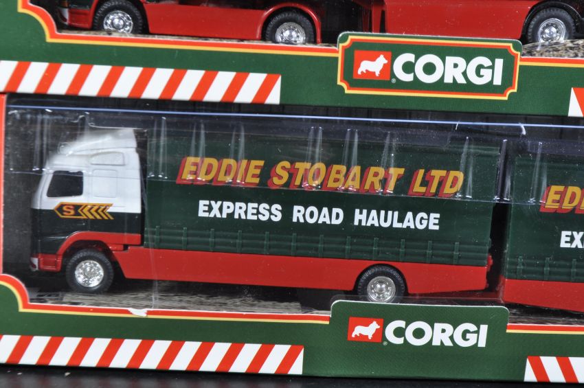 A collection of x3 assorted Corgi made Eddie Stobart diecast model trucks and lorries comprising; 11601 ERF KV Low Loader, 59516 Volvo Short Wheelbase Lorry with Close Coupe Trailer and 59503 Scania Curtainside Trailer. All contents appearing mint, within original boxes.