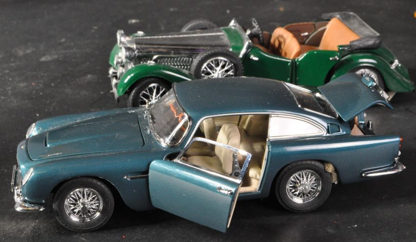 A collection of x5 assorted Danbury Mint and Franklin Mint precision scale diecast models to include; Danbury Mint 1964 Aston Martin DB5, Franklin Mint 1907 Rolls-Royce Silver Ghost, 1938 Alvis 4.3 Litre, 1935 Mercedes Benz 500K Special Roadster and a Crestley Collection MGB Mk1. Highly detailed scale models.