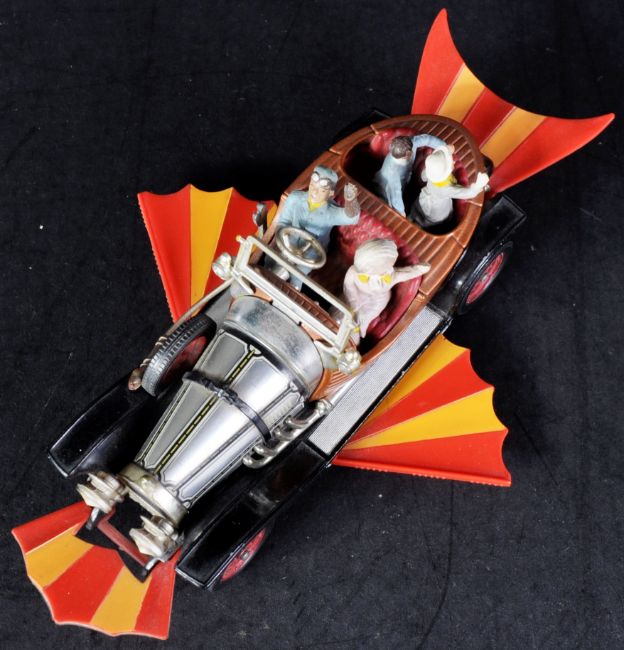 An original vintage Corgi Toys diecast model No. 266 Chitty Chitty Bang Bang car. The car having brown and red body work with working retractable wings and x4 character passengers. Model appearing VG+