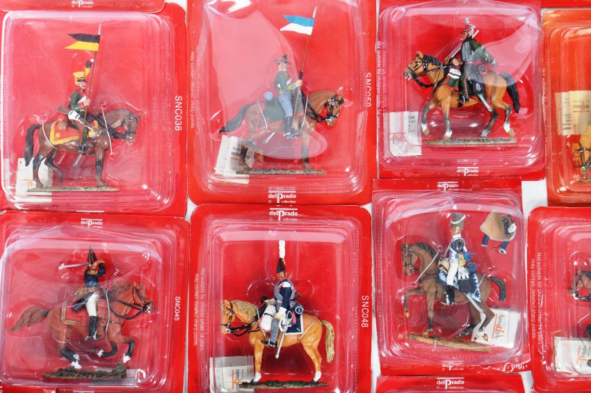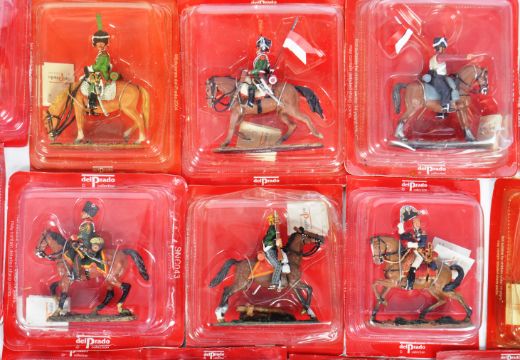 A large collection of approximately x35 assorted Del Prado made lead toy soldiers. The highly detailed horseback / cavalry soldiers of lead construction are pro-painted to depict the most famous soldiers and regiments from the 19th Century / Napoleonic War eras. Examples to include; Sergeant of the British Light Dragoons1795, Private from the 2nd Regiment King's German Dragoons 1812, Officer from Kellerman's Hussars, Trooper from 1st Portuguese Cavalry Regiment and others. All models within original blister packs.