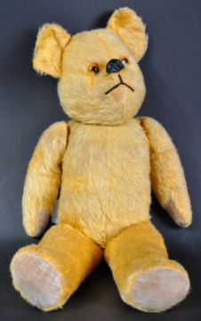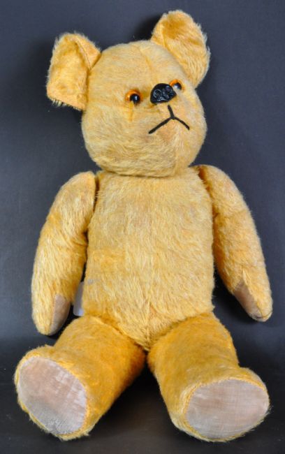A charming vintage English soft toy teddy bear, likely Chiltern or Chad Valley. The bear firmly stuffed with short golden mohair, fully jointed limbs and felt padded paws. Glass beaded eyes, wax covered nose and stitched mouth. A well kept example. Measures approx 50cm.