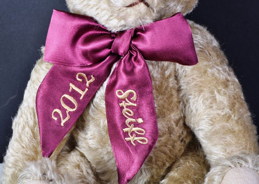 An original vintage Limited Edition German Steiff made soft toy teddy bear 664076 ' Year Bear 2012 '. The bear having sand coloured mohair fully jointed limbs and a maroon bow embroidered ' 2012 Steiff '. Complete with certificate and original box. Measures approx 32cm.