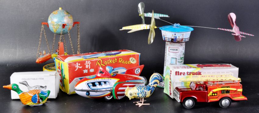 A collection of x6 vintage tinplate / wind up clock work toys to include; a Schylling Aerodrome, West Germany made Merry-Go-Round Carousel, a French friction motor Fire Engine, boxed Rocket racer and a small cockerel and duck.