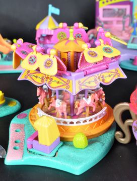 A collection of original vintage Blue Bird Polly Pocket playsets with doll figures to include; 1994 Home On The Go, 1996 Rides & Surprises, 1996 Spin Pretty Carousel, 1996 Rocket Ride, 1996 Jewel Magic Ball, 1998 Pont Adventure, 1999 Dream Builders Art Studio and 1999 Gym Turnfest Exercise Floor.