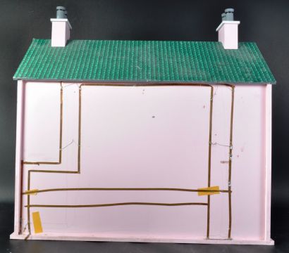 A vintage hand built two-storey town house dolls / doll's house. The house comprising of 4 rooms across two storeys including two upstairs bedrooms and a downstairs dining room and living room lounge. Fully furnished with all miniature accessories and figures. Two front opening panels for ease of access. Very well made and an impressive display. The outside finished in pink and the windows decorated with flowers and plant pots.NB: photographs of the dolls house set up have been provided by the vendor before the contents being securely packed away for transportation. Whilst every effort was made to pack the contents safely, East Bristol Auctions cannot guarantee condition, completeness nor accuracy of furnishings as they remain wrapped.DELIVERY - This item can be delivered nationwide by courier. Please click on the 'Shipping' tab and view rates for 'Furniture Delivery'. All costs dependent upon size of item and specific location. Please contact us directly for a specific quote.