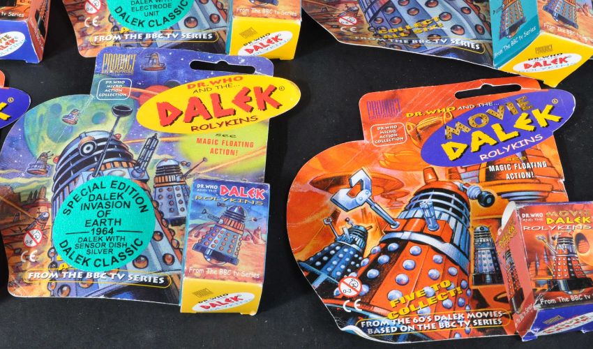 Doctor Who - Product Enterprise - a collection of x10 Product Enterprise made ' Dalek Rolykins ' action figures. Each figure with removable accessories. Includes some Limited Edition variations. All contents appear as new (we cannot guarantee completeness as not all are checked), with the packaging in various conditions.