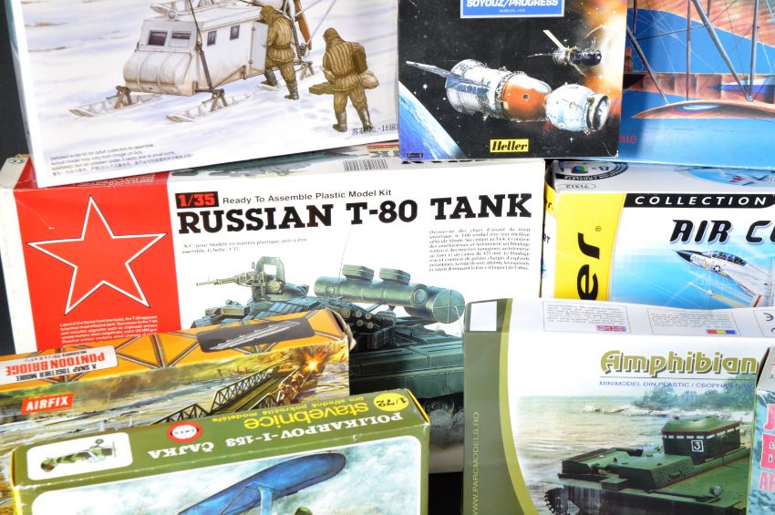 A collection of x13 assorted plastic model kits of various scales and makers. Examples to include; Lindberg 1/35 scale Russian T-80 Tank, Airfix 00 scale Pontoon Bridge, UniModel 1/72 scale Sherman Tank with mine exploder, Mirage Hobby 1/35 scale Armoured Concrete Bunker, Trumpeter 1/35 scale Soviet NKL-16 Aerosan and others. All kits appearing complete and unused with sealed packets but this remains unchecked by us.