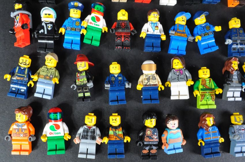 A large collection of x50 assorted original Lego minifigures, various themes and examples including Lego City, Police, Knights, Nexo, Ninjago and others including some custom figures. All genuine Lego pieces.