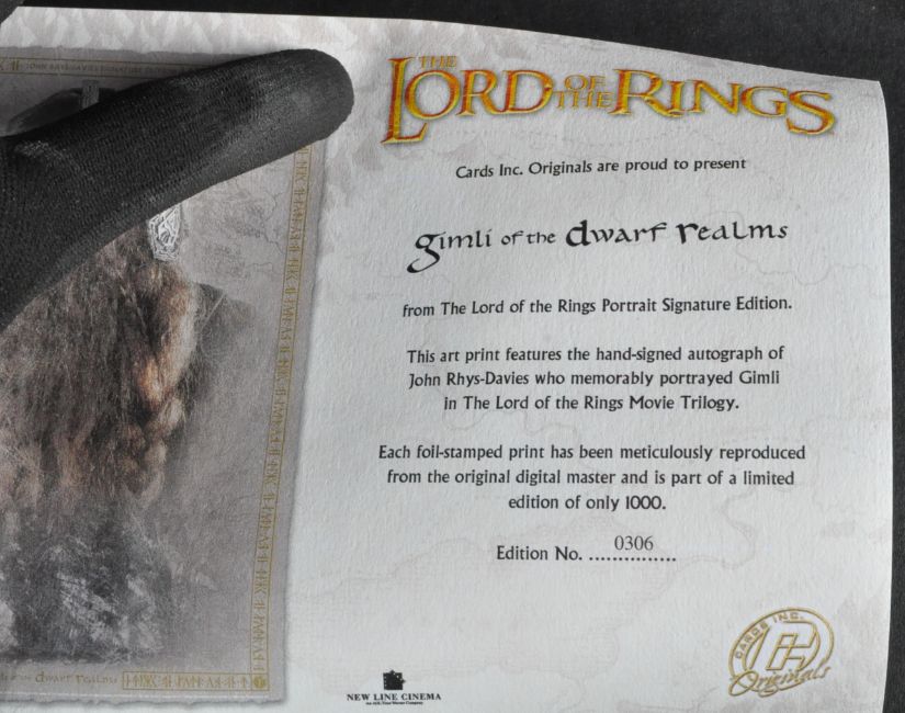 Lord Of The Rings - John Rhys-Davies ( Gimli ) autograph - an original Cards Inc Limited Edition lithographic art print of Davies signed neatly in gold ink to the bottom portion of the print. Complete with certificate of authenticity and tube packaging. Limited to 1000 prints only.