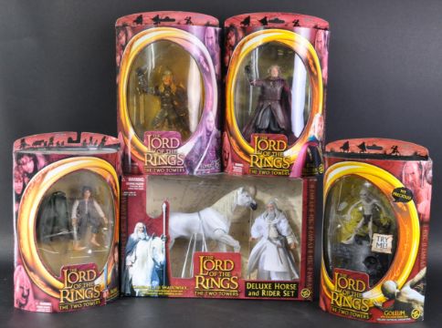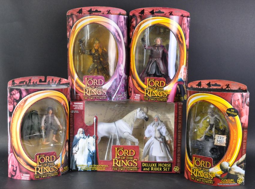 A collection of x5 assorted Toy Biz made LOTR Lord Of The Rings ' The Two Towers ' playset action figures to include 81180 Gandalf and Shadow Deluxe Horse Rider Set, 81145 Frodo, 81160 Eomer, 81160 King Theoden and 81170 Gollum. All contents with original boxes, still attached to inner packaging and likely unused.