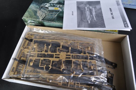 A collection of x5 large scale Military themed plastic model kits to include; Mini Hobby Models 1/200 scale U-Boat Type IX B Warship, Heller 1/35 scale AMX 30/105 Tank, Trumpeter 1/32 scale The Plaaf MiG-15 Bis Fighter, Frog Model Kits 1/32 scale Mikoyan Gurevich MiG 15bis Fighter and Mirage Hobby 1/35 scale Uniwersalny Transporter C7P. All kits appearing unused within original boxes.