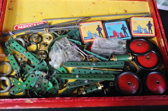 An original vintage Meccano made construction set / outfit set No. 7 in early red card box with paper label to box lid. Appearing complete but remains unchecked by us.
