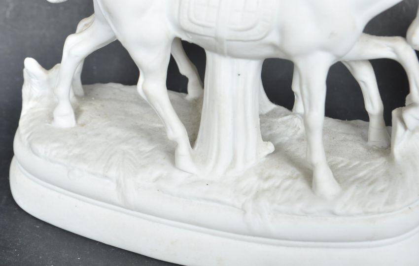A collection of 19th century Victorian Parianware figurines comprising of a group of three girls stood on naturalistic base together with a two horses raised on an oval base. Largest measures 18cm wide.