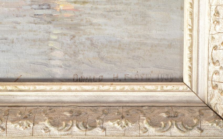 Donald Henry Floyd (1892-1965) - A 20th Century oil landscape painting depicting a rural scene with windmills below a blue cloudy sky and shimmering laker surround by green grass. Set to a carved frame. Measures approx; Signed Donald H Floyd 1930. 75cm x 62cm.