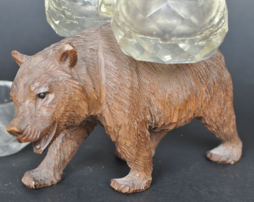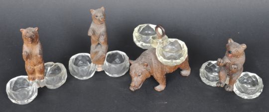 A collection of four 19th Century German Black Forest hand carved figural table salts / cruets in the form of bears. Each having cut glass condiment dishes with bear figurine to top. Largest measures approx; 10cm.