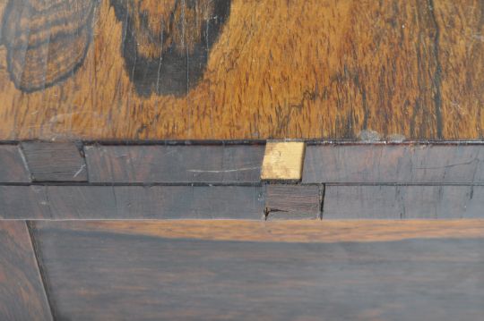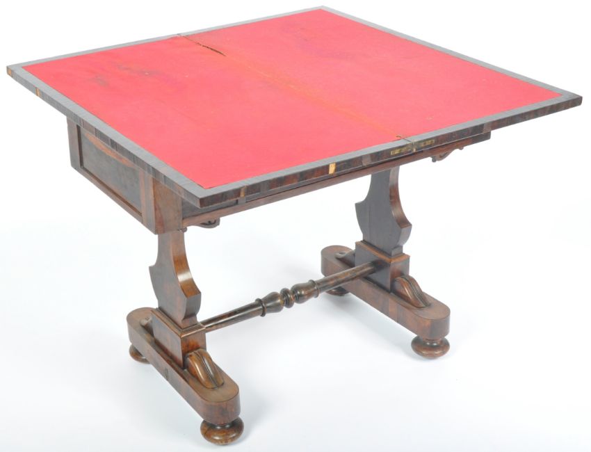 An early 19th Century George III rosewood games / card table. The table having a fold over top with red felt lining and single drawer below flanked by faux drawers to each side. Raised on shaped supports united by a single turned stretcher upon trestle supports on bun feet. Measures approx; 75cm x 92cm x 46cm.