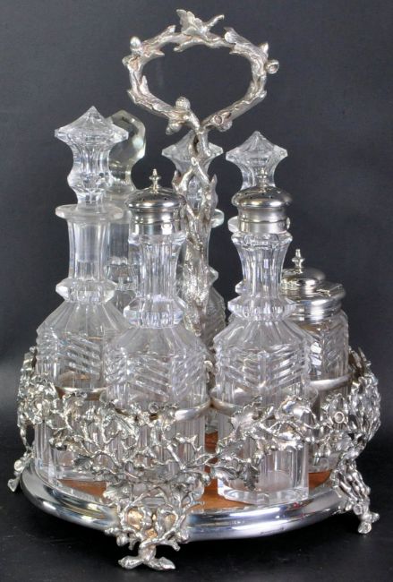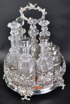A 19th Century Victorian Elkington & Co seven piece cut glass cruet set comprising of six cut glass and hallmarked silver bottles / table salts set to a plated stand. Measures approx; 27cm tall.