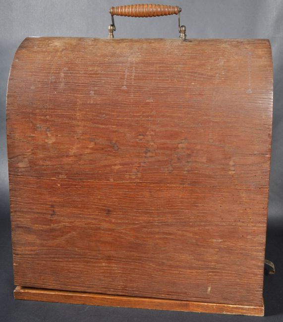 A large 20th Century silver plated table lighter in the form of a church having a tall spire with the top removing to reveal the lighter with a small hatch door below for oil / wick. The building below with lift top roof reveal a storage compartment for cigarettes / cigars with two barrels to the exterior for matches. silver-plated base with all raised on a stepped oak base with domed top oak carry case. Unmarked. Measures approx; 49cm x 45cm x 28cm.