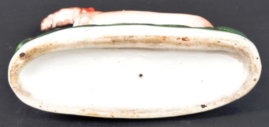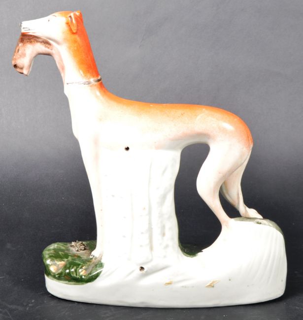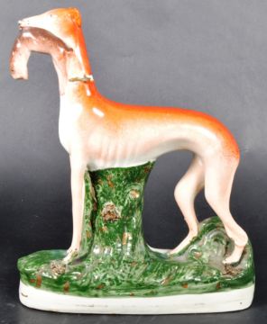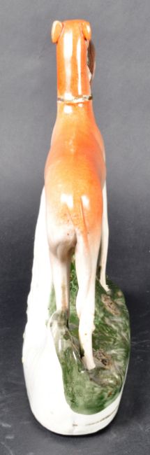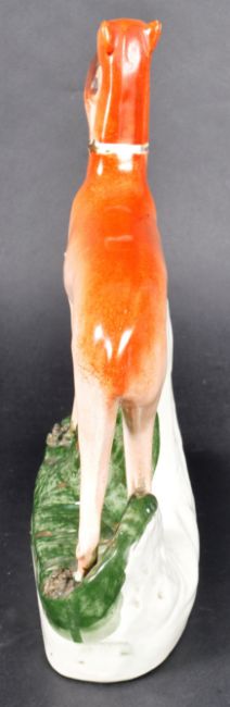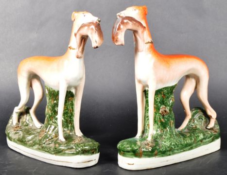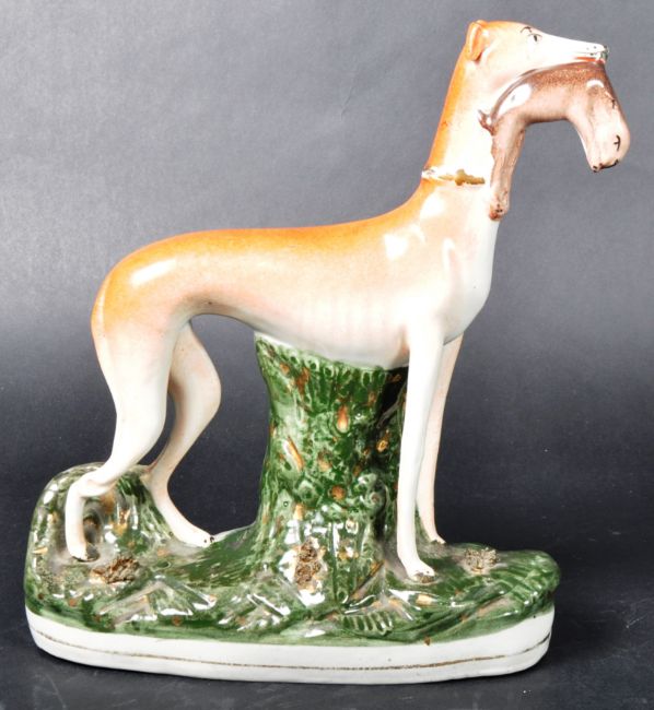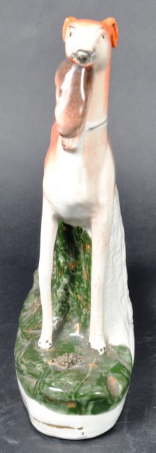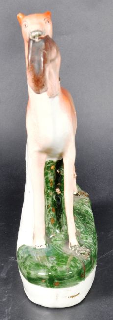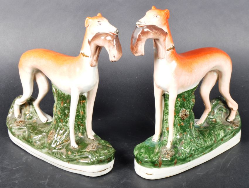 A matching pair of 19th Century Victorian Staffordshire hand painted figures in the form of standing sporting hounds / hunting dogs, each with a hare in its mouth. Each raised on naturalistic bases. Each measures approx; 28cm x 23cm x 7cm.