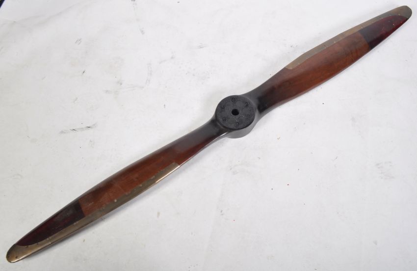 A large early 20th Century wooden propeller of unknown origin having applied brass bindings with central hub. Measures approx; 182cm.
