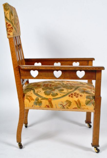 An early 20th century Arts & Crafts armchair in the manner of CFA Voysey (1857-1941) raised on squared legs with castors having over overstuffed seat and top rail in William Morris revival fabric. The seat being flanked by pierced heart elbow rests with tulip carved rails atop.The back with upholstered top rail over pierced heart railed back rests. Measures approx; 102cm x 67cm x 62cm.Provenance; originally consigned from Tredean House: Tredean House, Devauden, Monmouthshire is a country house dating from 1901-02. It was designed in an Arts and Crafts style by the architect Arthur Jessop Hardwick.