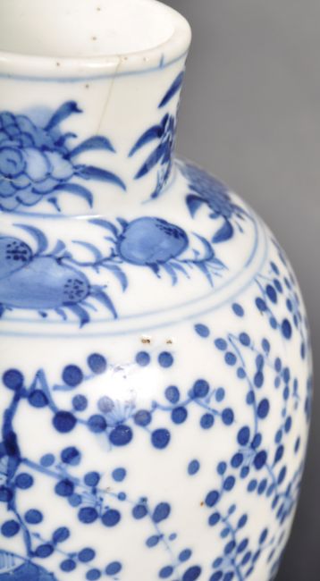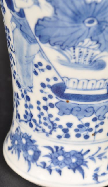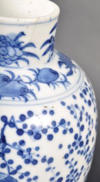 A 19th Century Chinese Qing dynasty Kangxi mark blue and white porcelain vase. The vase of baluster form with Foo dog decorated cover / lid. The vase body hand decorated with scenes of branches and figures moving a large vase. Four Character Kangxi mark to underside. Damage / repair to neck. Measures approx; 28cm tall.