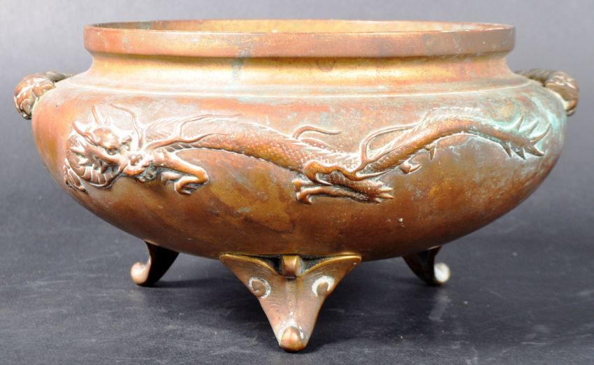 A 19th Century Meiji Period bronze censer. Classic bowl shape raised on three butterfly / moth feet. Decorated with two traditional style dragons to the exterior & foo dog mask handles. Condition; various patches of oxidisation but wear commensurate with age. Measures approx; 14cm x 27cm.