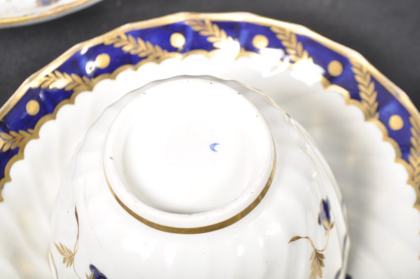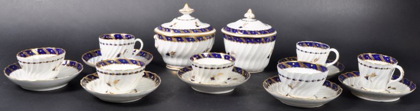 A small collection of 18th Century George III Worcester China tables wares comprising of two lidded pots, multiple saucers with cups and tea bowls. Each piece with cobalt blue rims and gilt wheat detailing with further gilt decoration throughout. Wear commensurate with age. Saucers measure approx; 14cm and cups measure approx; 9cm