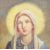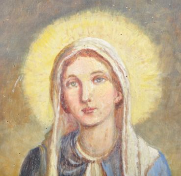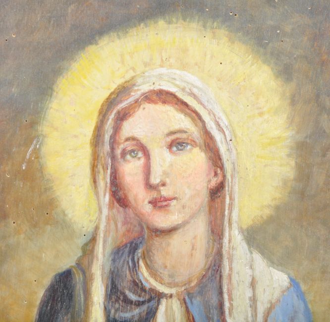An unusual 17th Century manner Religious ecclesiastical altar back comprising of a central painting of a Mary The Mother with three Bacchanalian cherubs to top. The frame having an arched top with carved border and crucifix pediments. Flanked by reeded Corinthian columns with further painted details having folding candle sconces. Measures approx; 201cm x 110cm.