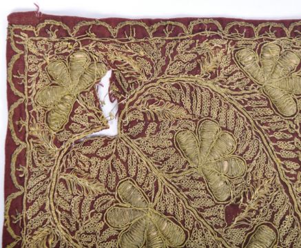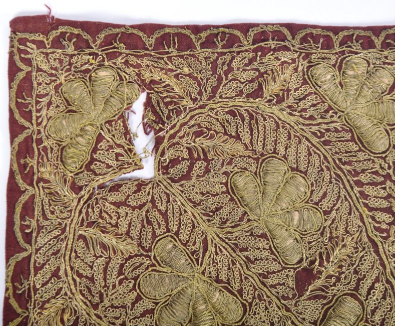 Two 20th Century Indian silver and gold bullion thread woven tapestries. One tapestry have rouge fabric with woven thread decoration forming patterns throughout with the other woven on brown fabric. Wear commensurate with age with some thread loss and damage to the corner of one. Largest measures approx; 78cm x 82cm.
