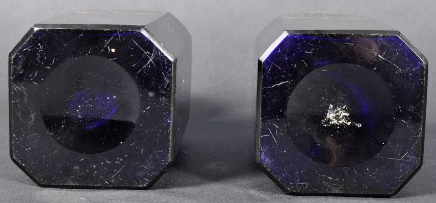 A pair of 19th Century George III Bristol Blue glass drinks spirits drinking decanters comprising of one decanter marked Rum and another marked Hollands. Both with facet cut ball shaped stoppers, facet and lipped necks and square facet edge bodies. Some minor age related wear present and chip to the neck of one decanter and wear to stopper. Measures approx; 21cm tall.