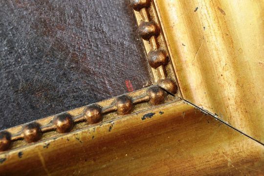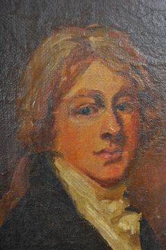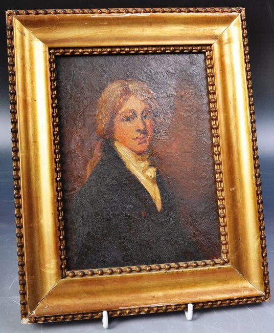 A 19th Century oil on canvas portrait painting study of Joseph Mallord William Turner RA. Set within a gilt frame. Writing to the back of the painting in red. Painting measures approx; 19cm x 14cm. Frame measures approx; 28cm x 22cm.