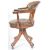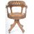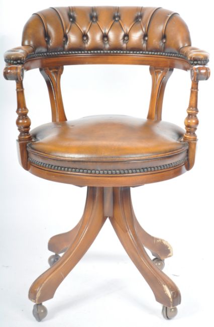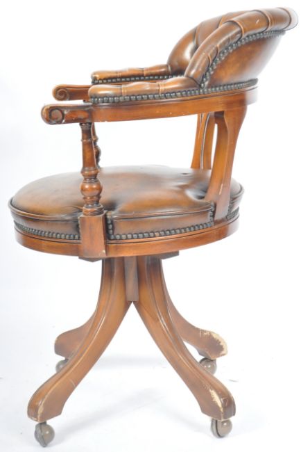 A 20th Century 1980's reproduction Victorian style brown leather Chesterfield Captains deep button back swivel office / desk chair having carved spindles with shaped arms and backrest. Circular seat raised on a splayed base terminating on castors. Measures approx; 90cm x 61cm x 56cm.