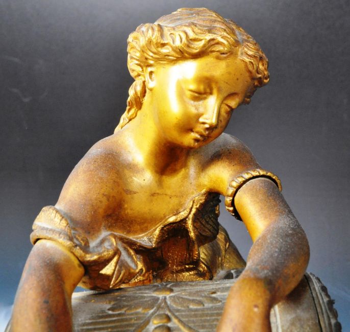 An early 20th Century French ormolu mantel clock by Japy Freres of Paris. The clock having a white enamel face and barrel cylinder movement. The ornate case set with maiden & cherub with repousse panels, laurel wreaths and acanthus scrolls. Raised on a carved matching plinth base. Measures approx; 36cm x 46cm.