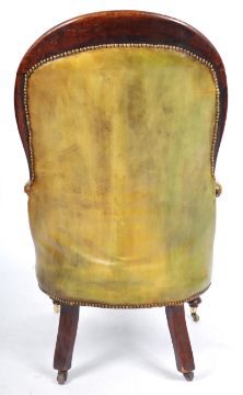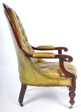A 19th Century Victorian green leather and mahogany fireside armchair / library chair having a shaped button backrest with leather covered armrests and buttoned seat rest. Show wood frame throughout with all raised on turned supports upon brass castors. Arm chair measures approx; 109cm x 74cm x 63cm.