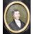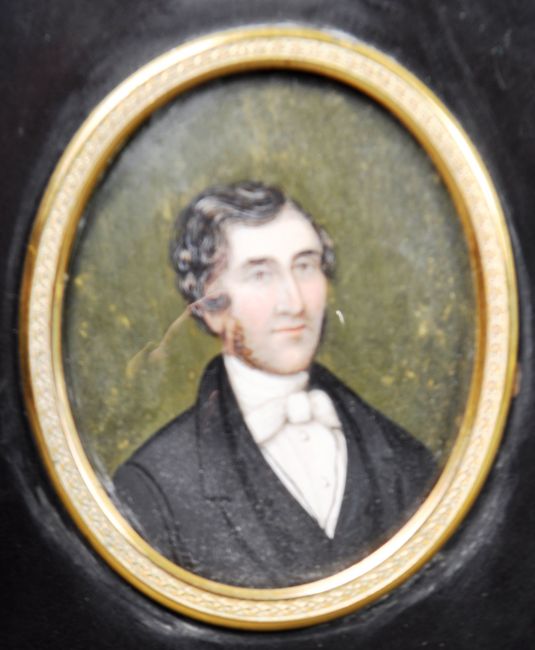 An 18th Century watercolour on ivory portrait painting miniature depicting a gentleman, possibly John Thirnbeck of London. The sitter depicting in black formal dress jacket with white shirt. Set to an ebonised square frame with oak leaf mount. Measures approx; 11cm x 13cm.