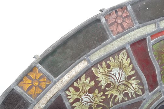 A 19th Century stained glass window panel of Gothic influence. The arched top panel consisting of multiple coloured leaded glass panels decorate with leaves and scene of Church / Cathedral building. Measures approx; 48cm tall.