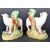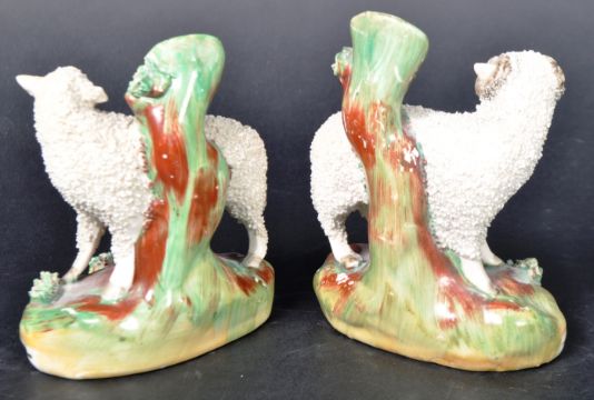 A pair of 19th Century Victorian Staffordshire sheep and ram spill vases / holders. Each depicting the animal with brocade decoration and painted finish. Some wear commensurate with age however overall good. Measures approx; 14cm tall.