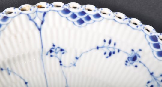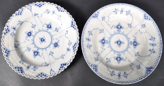 A pair of Royal Copenhagen porcelain cabinet plates of fluted form and decorated in hand painted blue details. The reverse with makers marks and numbered 1084 & 571. Measures approx; 26cm wide.